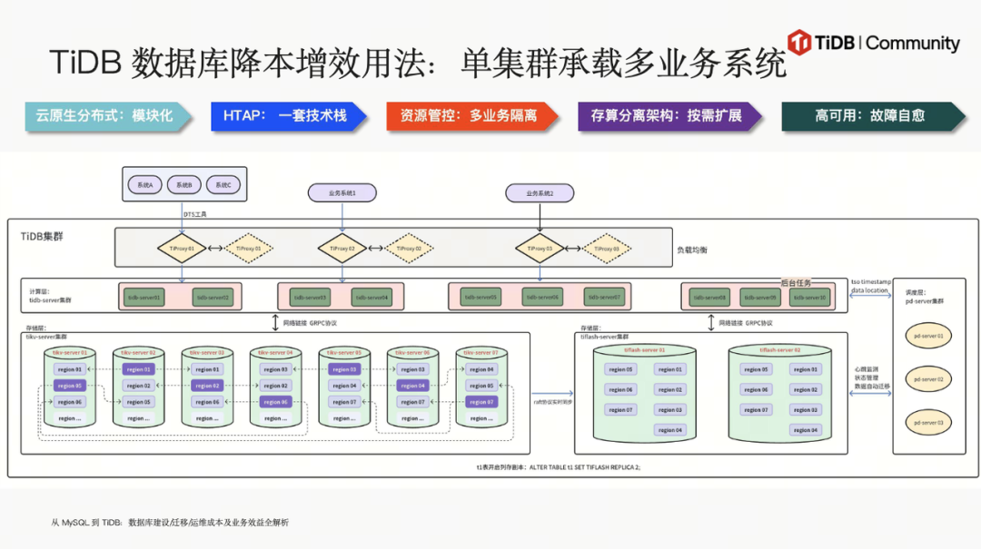 初始建设成本方面,对于大型 MySQL 系统,TiDB 可简化复杂架构,减少数据冗余和硬件成本;小型 MySQL 整合时,TiDB 提升资源利用率,降低综合硬件成本。迁移成本上,TiDB 提供全链路迁移工具,涵盖数据迁移、比对、回放和回退,简化实施过程,降低成本与风险。运维成本层面,TiDB 简化安装部署,减少高可用问题,提升扩缩容和 DDL 效率,缩短数据闪回周期,极大降低运维投入。