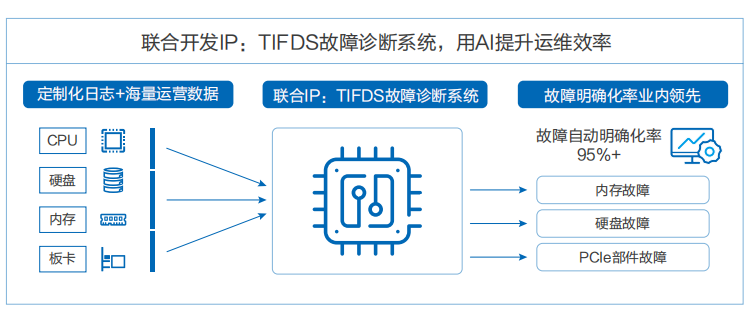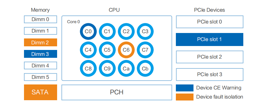 对服务器内所有部件进行全生命周期的寿命和运行状态进行跟踪,通过机器学习的算法对高风险的部件提前进行预警,降低服务器在高负荷运行状态下的突然失效。另外对已发生故障的部件,TIFDS可以按部件类别做出相应的隔离措施处理,避免单一非必要部件故障影响整机系统的运行。