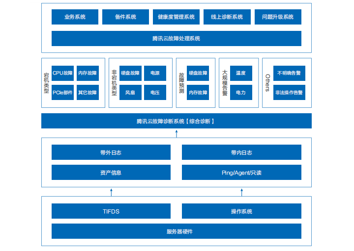 TIFDS (Tencent &Inspur Fault Diagnosis System) 故障诊断系统是服务器健康监管技术及故障预警诊断技术的总称,旨在实现运维工作任务由人工离线分析向自动智能在线识别的方向发展,建立一套以带外BMC为中心的自动化故障诊断系统,提升服务器故障预警能力、故障诊断明确率、以及停机维护效率,减少非计划停机时间,提升服务器全生命周期的健壮的RAS特性(可靠性,可用性及可维护性)。