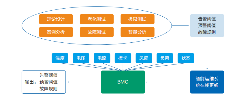 通过BMC实时监控服务器系统上遍布各处的电压、电流、温度传感器信息,实时监控电源、风扇、以及各部件的工作状态和工作负荷情况;根据可在线更新的告警阈值、预警阈值和故障判定规则,可实现对服务器中存在风险的位置进行故障预警、故障告警或故障判定,并时刻上报智能运维系统。