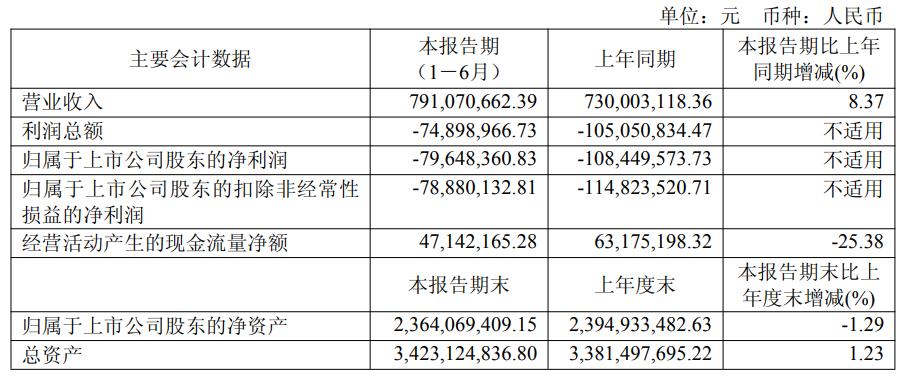 其中第二季度,公司营业收入为4.15亿元,同比上升8.7%;归母净利润自去年同期亏损4658万元变为亏损3492万元,亏损额有所减少;扣非归母净利润自去年同期亏损5244万元变为亏损3348万元,亏损额有所减少;EPS为-0.0765元。