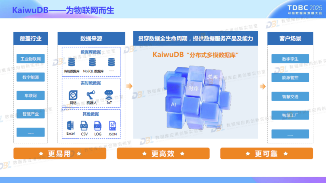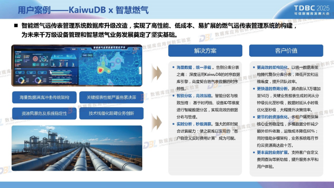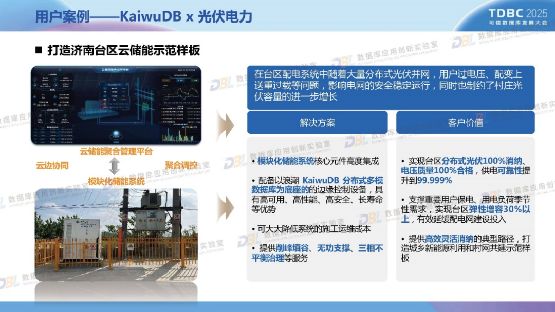 浪潮分布式多模数据库 KaiwuDB 针对物联网AIoT场景深度优化,构建以"多模融合架构"为核心,集成高性能时序引擎、分布式及原生AI驱动的预测及自治能力,有效支撑能源物联网千万级设备接入、百万级数据秒级写入的高并发场景。行业实践层面,KaiwuDB数据库已成功赋能济南台区分布式云储能项目实现光伏100%消纳率与99.999%的供电可靠性,在内蒙古碳计量中心完成超千万设备节点接入与千万级数据毫秒级写入;同时,通过整合浪潮服务器、云平台、智能终端等多元资源,KaiwuDB 可构建能源领域一体化的云边端平台方案,为智能电网、虚拟电厂建设、"双碳"目标监测等战略场景构建下一代数据底座,为大会探索能源数据高质量发展贡献了创新实践经验。
