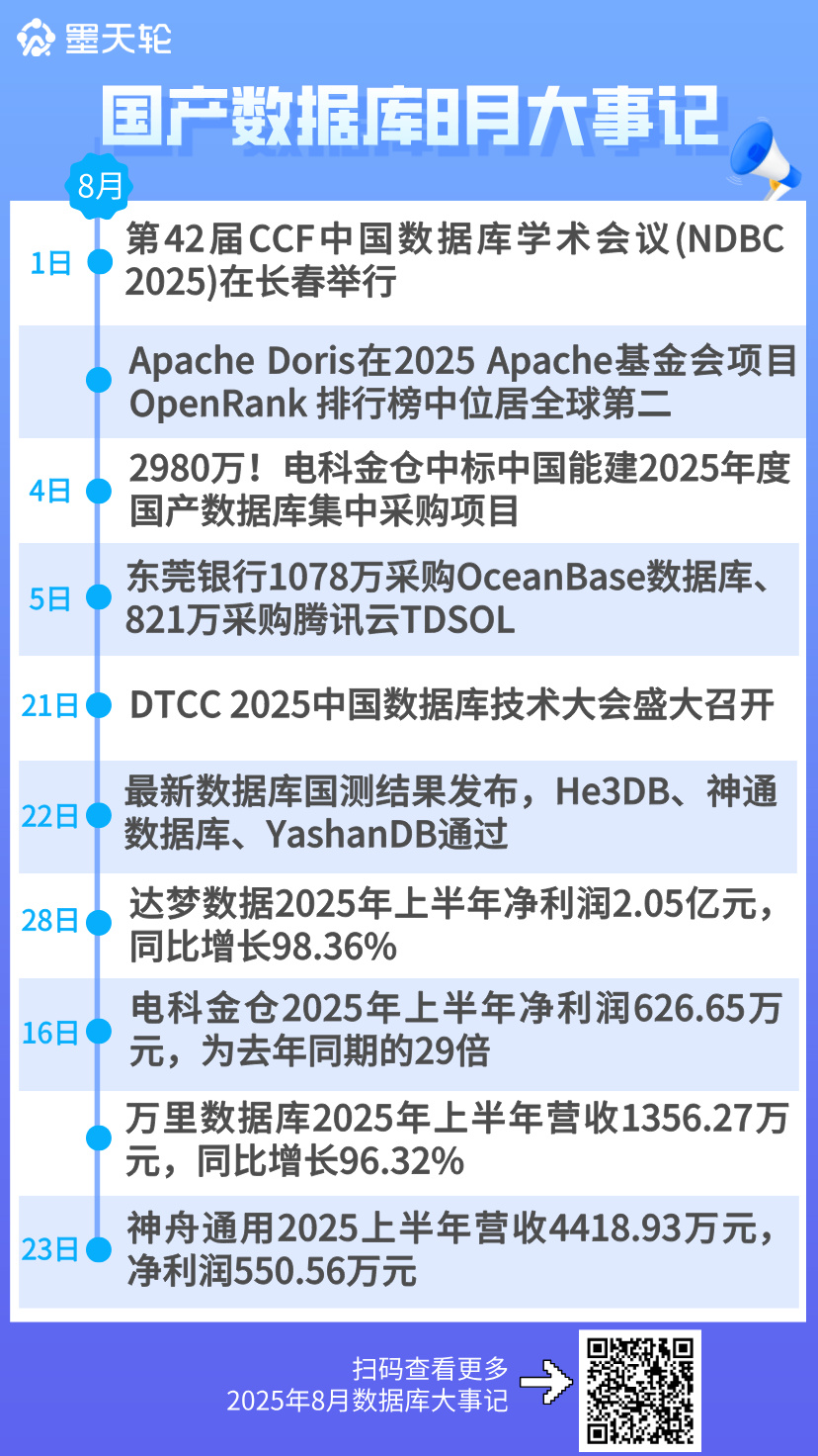 2025年8月诞生了2个千万级数据库大单:金仓+海量+达梦+瀚高入围中国能建近三千万数据库框采项目,易诚互动中标东莞银行1078万元OceanBase数据库项目,以及腾讯云821万元TDSQL数据库项目。第42届CCF中国数据库学术会议与DTCC 2025中国数据库技术大会盛大召开;星环科技递交港股上市申请;最新安全可靠数据库测评结果发布;Apache Doris在 Apache 基金会项目OpenRank排行榜中位居第二;金仓数据库V9全平台版登场。