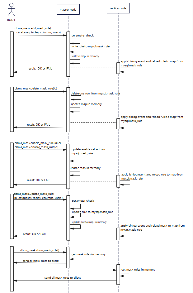 2)root用户连接到数据库主节点,执行增删改接口,数据库先校验参数,参数检验通过之后,更新系统表mysql.mask_rule以及内存中的map,内存中的map保存了限流规则,可快速匹配是否需要限流,更新系统表的时候会写binlog,只读回放binlog会更新只读节点的系统表mysql.mask_rule以及只读节点内存中的map。