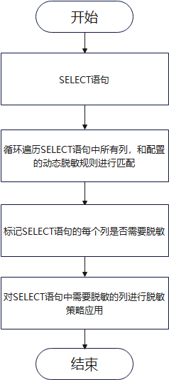 查询语句执行之前,检查SELECT列是否需要脱敏,若需要,则在数据发送到客户端之前进行脱敏处理。动态脱敏规则应用流程图如下:
