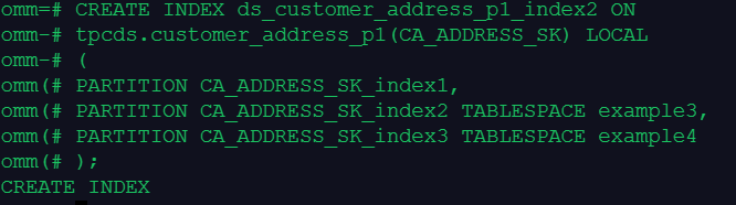 CREATE INDEX ds_customer_address_p1_index2 ON tpcds.customer_address_p1(CA_ADDRESS_SK) LOCAL ( PARTITION CA_ADDRESS_SK_index1, PARTITION CA_ADDRESS_SK_index2 TABLESPACE example3, PARTITION CA_ADDRESS_SK_index3 TABLESPACE example4 );