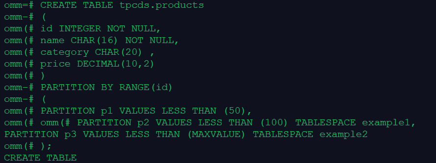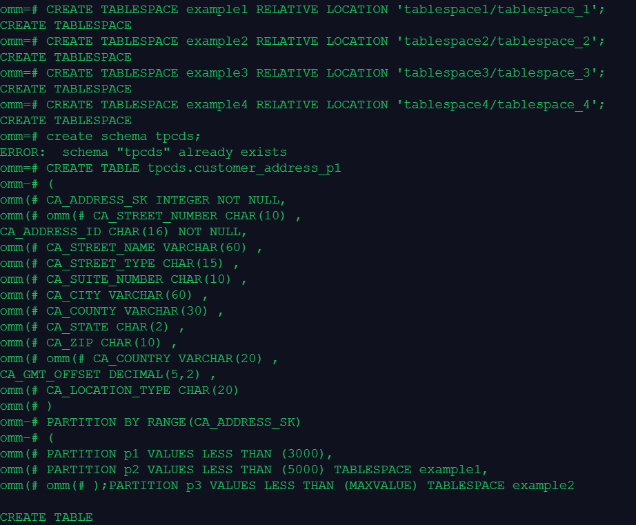 CREATE TABLESPACE example1 RELATIVE LOCATION 'tablespace1/tablespace_1'; CREATE TABLESPACE example2 RELATIVE LOCATION 'tablespace2/tablespace_2'; CREATE TABLESPACE example3 RELATIVE LOCATION 'tablespace3/tablespace_3'; CREATE TABLESPACE example4 RELATIVE LOCATION 'tablespace4/tablespace_4'; create schema tpcds; CREATE TABLE tpcds.customer_address_p1 ( CA_ADDRESS_SK INTEGER NOT NULL, CA_ADDRESS_ID CHAR(16) NOT NULL, CA_STREET_NUMBER CHAR(10) , CA_STREET_NAME VARCHAR(60) , CA_STREET_TYPE CHAR(15) , CA_SUITE_NUMBER CHAR(10) , CA_CITY VARCHAR(60) , CA_COUNTY VARCHAR(30) , CA_STATE CHAR(2) , CA_ZIP CHAR(10) , CA_COUNTRY VARCHAR(20) , CA_GMT_OFFSET DECIMAL(5,2) , CA_LOCATION_TYPE CHAR(20) ) PARTITION BY RANGE(CA_ADDRESS_SK) ( PARTITION p1 VALUES LESS THAN (3000), PARTITION p2 VALUES LESS THAN (5000) TABLESPACE example1, PARTITION p3 VALUES LESS THAN (MAXVALUE) TABLESPACE example2 );