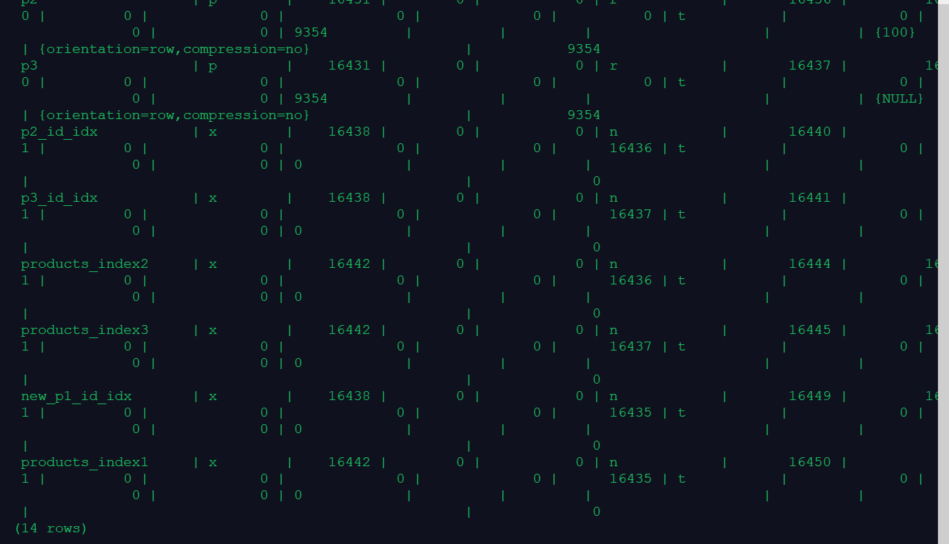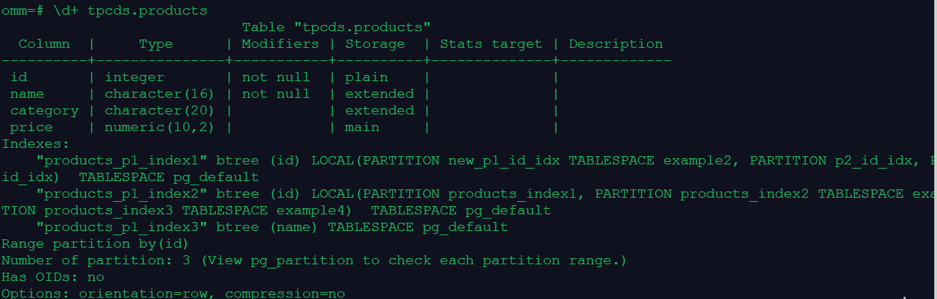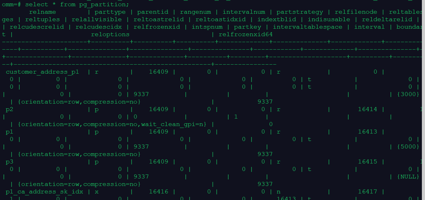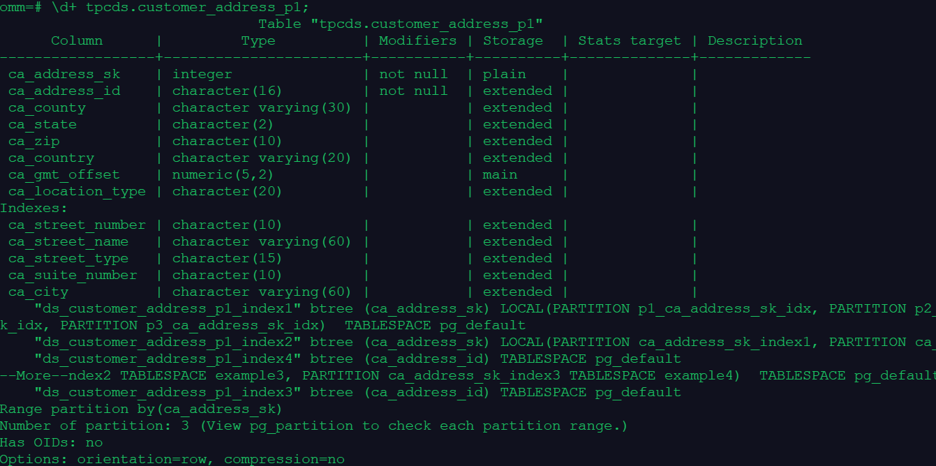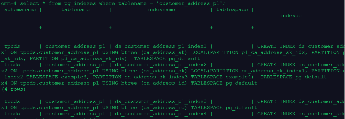 \d+ tpcds.customer_address_p1; select * from pg_indexes where tablename = 'customer_address_p1'; select * from pg_partition;