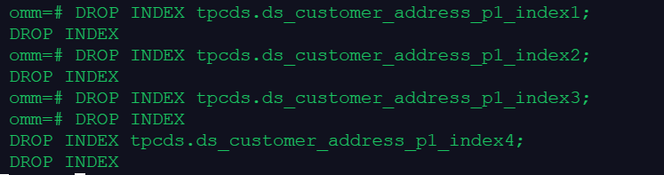 DROP INDEX tpcds.ds_customer_address_p1_index1; DROP INDEX tpcds.ds_customer_address_p1_index2; DROP INDEX tpcds.ds_customer_address_p1_index3; DROP INDEX tpcds.ds_customer_address_p1_index4;