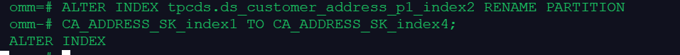 ALTER INDEX tpcds.ds_customer_address_p1_index2 RENAME PARTITION CA_ADDRESS_SK_index1 TO CA_ADDRESS_SK_index4;