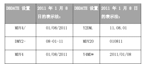 对于“美国英语”语言环境,DBDATE 的缺省值为 MDY4/,其中 M 表示月,D 表