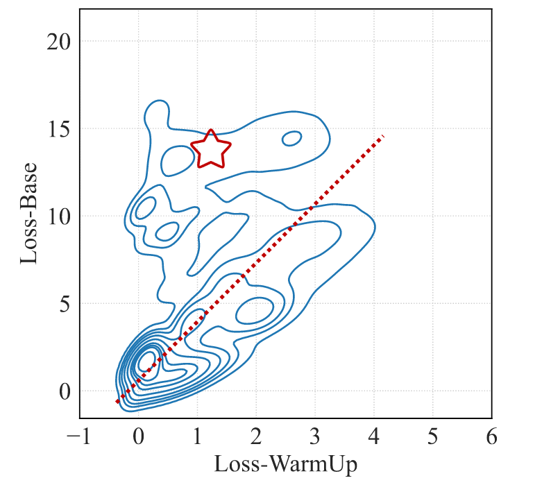 即便如此,训练后的模型在通用能力和领域特定性能上仍有下降。通过分析,作者发现了一部分“低质量”数据(图2中红色五角星区域),它们要么质量差,要么引入了与基础模型的先验分布显著偏离的全新知识。此外,训练后这些数据点的损失减少量仍然小于整个数据集观察到的平均减少量(图2虚线趋势线)。这证实了这些数据点确实是“低质量”的,它们可能会对模型学习产生较大的负面影响。