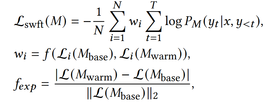 其中,权重wi是一个函数 f,它考虑了基础模型 (Mbase) 和预热训练模型 (Mwarm) 在该样本上的损失。通过这种方式,“低质量”数据将被自动分配较低的权重,使模型能更有效地关注匹配度高、质量好的数据,从而获得更好、更鲁棒的性能。