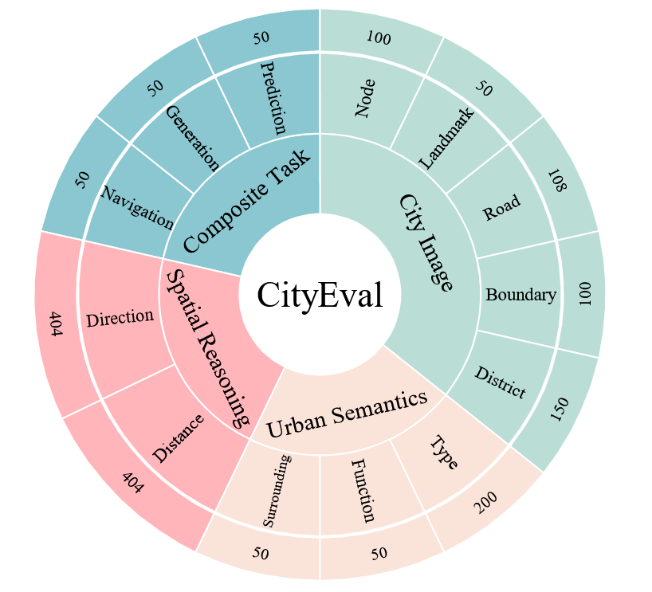 作者提出了一个系统性的评估基准 CityEval,以检验 LLM 在城市空间中的能力。如图3所示,评估基准包含四个子模块,强调人类空间认知的不同方面和城市科学的应用,包括城市意象、城市语义、空间推理和复合任务。