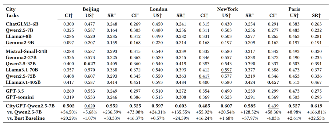 在CityEval上的实验结果如表1所示。总体而言,CityGPT-Qwen2.5-7B在大多数任务中显著优于所有基线模型,与最佳基线模型相比,CityGPT-Qwen2.5-7B在具有挑战性的空间推理任务中性能提升了33.33%。与它自身的原始版本Qwen2.5-7B相比,在城市语义任务中至少提升了5.68%,在空间推理任务中提升了236.59%。这些结果展示了CityInstruction数据集的有效性,并且充分证明了CityEval评估基准能够有效区分不同模型在理解城市空间上的能力。
