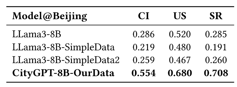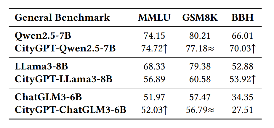表2展示了基于不同基础模型训练的CityGPT的性能,这表明 CityGPT 模型在通用能力方面通常与基础模型相当。