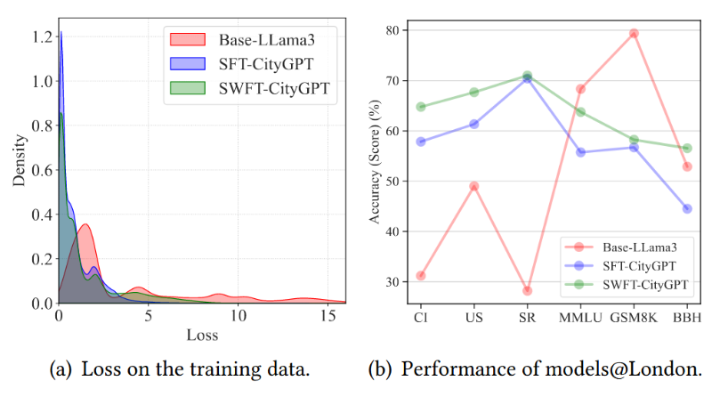 然而,实验结果表明CityGPT-LLama3-8B 在 MMLU 和 GSM8K 上有显著下降,CityGPT-ChatGLM-6B 在 BBH 上也有下降。作者使用之前提到的SWFT来解决这些问题。