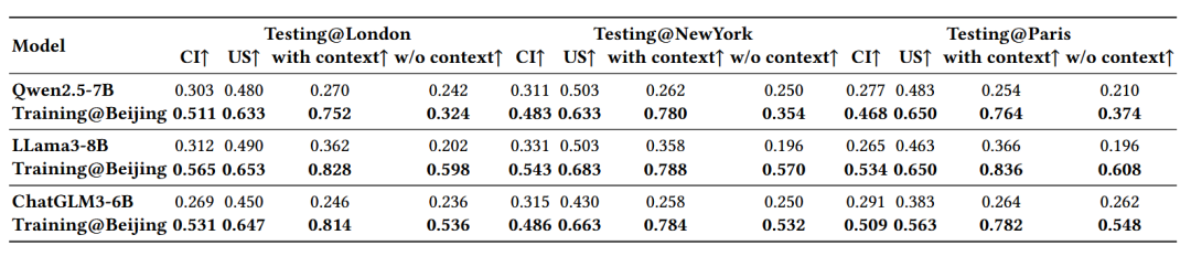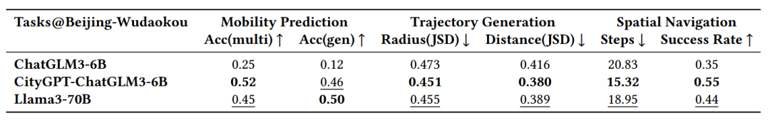 文章评估了CityGPT在空间知识和推理能力上的可迁移性。结果(表3)显示,在北京数据上训练的CityGPT在其他三个不同城市的CityEval评估中显著优于基础模型,这表明CityGPT确实学到了可以跨城市迁移的通用城市空间认知知识。在下游复合任务中(表4),CityGPT在没有任何与任务相关的指令数据训练的情况下,在移动性预测、轨迹生成和街道导航这三个任务中均显著优于ChatGLM3-6B,证明了CityGPT能够提高下游任务的性能。