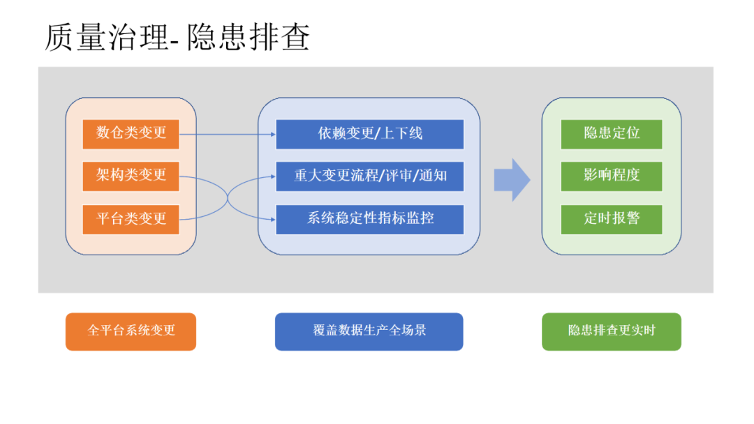 绝大多数数据质量问题源于“变化”。通过建立覆盖全平台系统变更、数仓类变更、依赖变更/上下线、架构类变更、平台类变更的隐患排查机制,能将问题扼杀在摇篮里。