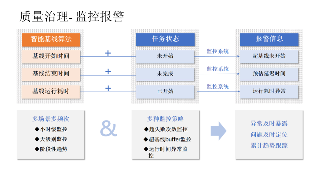 超基线buffer监控:应对轻微波动。 超失败次数监控:捕捉持续性故障。 运行时间异常监控:发现耗时异常的任务。