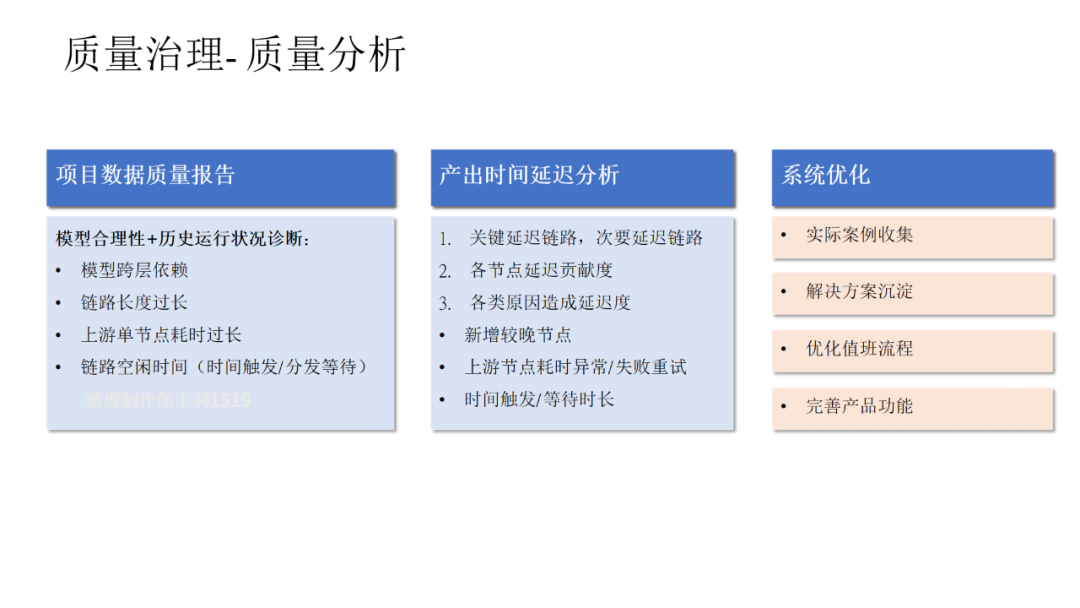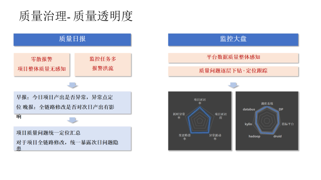 早报:快速知晓今日产出是否异常,并定位异常点。 晚报:评估全链路修改对次日产出的潜在影响,防患于未然。 统一汇总:将项目质量问题进行定期的统一定位与汇总,持续改进。