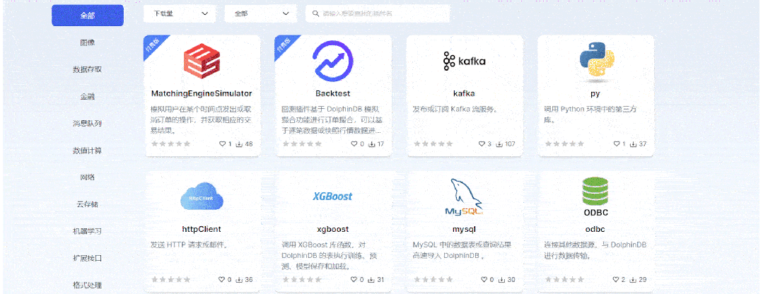 此外,DolphinDB 插件市场还为用户提供了涵盖行情接入、数据存取、消息队列、数值计算、机器学习等方面的数十种功能插件,为用户带来高效便捷的开发体验。