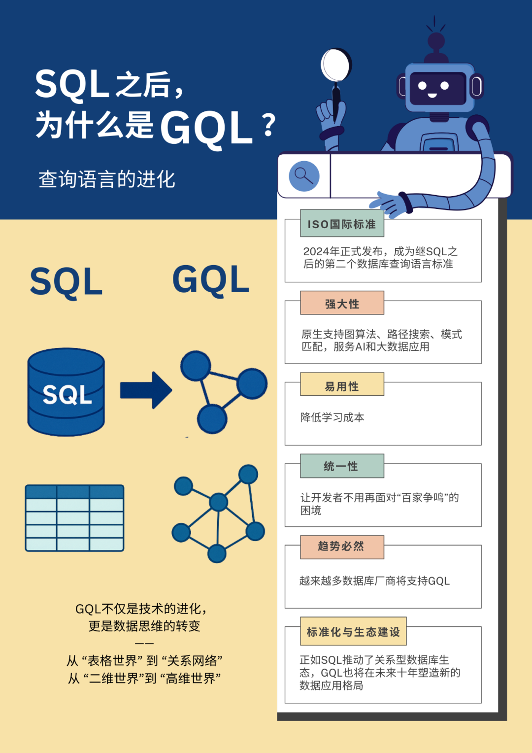 GQL核心意义不仅在于终结开发者面临的 “百家争鸣” 困境、兼具易用性与强大性,更在于其鲜明的未来导向 —— 通过原生支持图算法、路径搜索与模式匹配,能深度适配并服务 AI 及大数据应用需求。掌握 GQL 所承载的图思维与图查询能力,可显著提升复杂数据关系处理能力;随着越来越多数据库厂商的支持,GQL 将如 SQL 推动关系型数据库生态般,在未来十年塑造全新数据应用格局,最终开启以关系为核心的下一代数据时代。