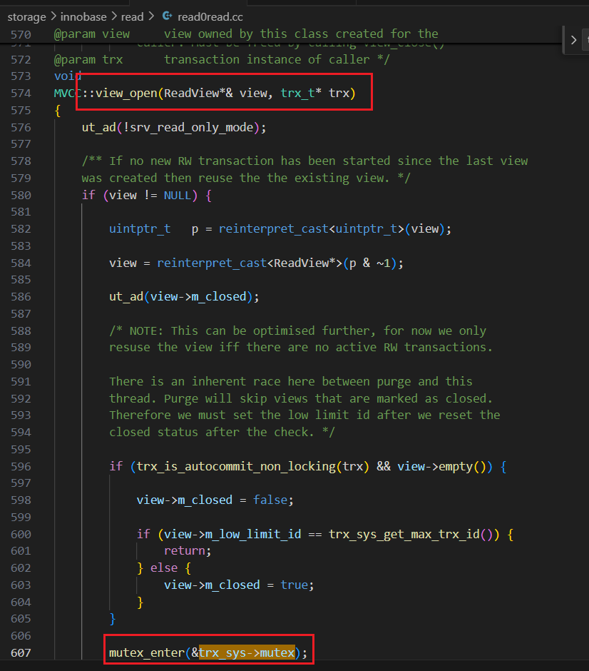通过调用mutex_enter(&trx_sys->mutex)函数获取mutex,通过trx_sys_mutex_exit()释放mutex。如下: