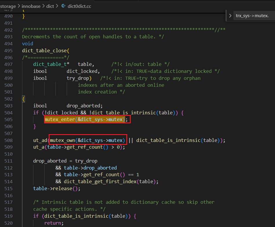 此时,我们则可以根据信息中的锁被创建的位置点,例如dict0dict.cc:1217初步查看是什么操作持有了锁。