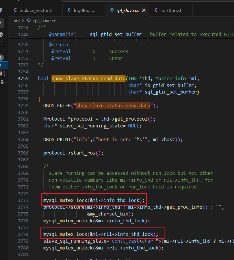在阅读源码的时候,我们可以根据自己想验证的点在对应代码处设置断点,模拟show slave status阻塞的场景。以我的测试环境为例,如果我想模拟show slave status阻塞的场景,则我可以在下图申请锁之前设置断点,例如: