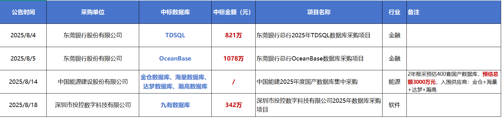 本文整理了2025年8月国产数据库的中标情况。