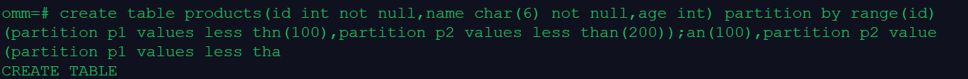 create table products(id int not null, name char(6) not null,age int) partition by range(id)(partition p1 values less than(100),partition p2 values less than (200));