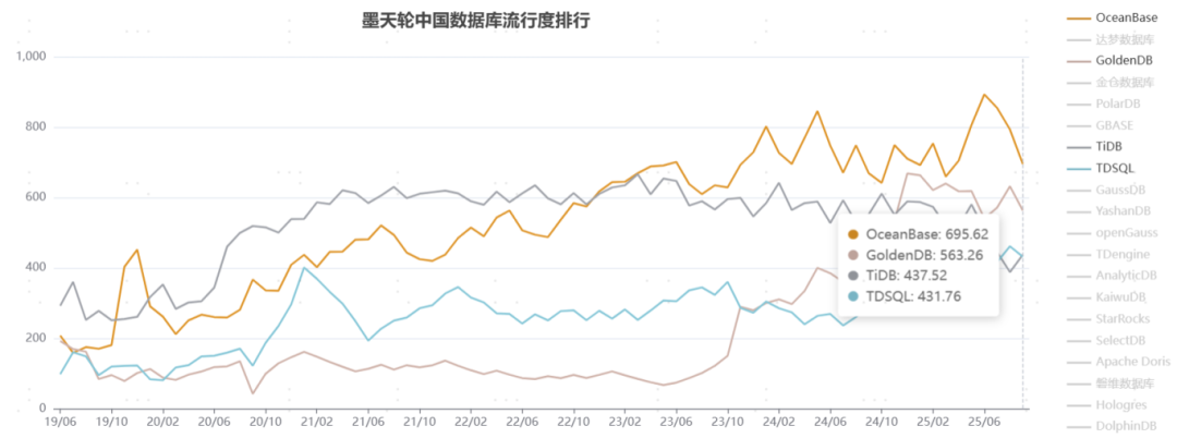 达梦数据库作为国产数据库领域的"常青树",自2019年起就保持着相对领先优势。其流行度数值稳定在600分以上高位区间,体现了其深厚的技术积累和早期市场布局的优势。达梦凭借在政务、能源等关键行业的先发优势,建立了坚实的客户基础和产品口碑,这种稳定性源于其长期坚持自主研发路线和对信创市场的精准把握。