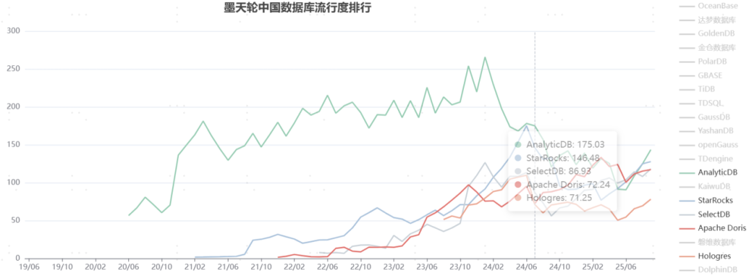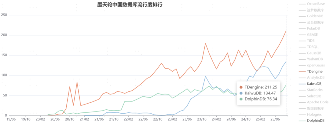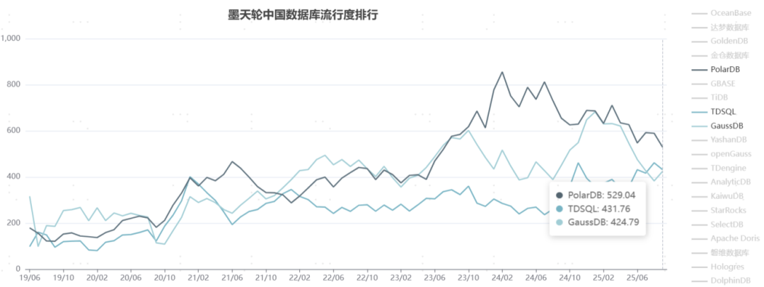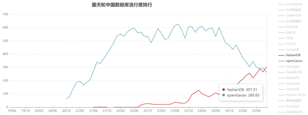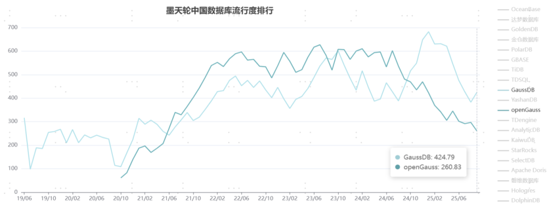 相比之下,开源产品openGauss则经历了先扬后抑的发展波折。早期凭借开源理念和技术先进性获得关注,流行度一度快速上升,但随后逐步下滑至260.83,跌出前十行列。这一轨迹深刻反映了开源模式在中国市场面临的挑战:企业用户更看重全栈服务和技术支持而非单纯代码开放;开源社区建设需要长期投入但商业回报缓慢;在关键行业场景中,企业往往更倾向于选择有商业保障的产品。