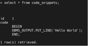 create table code_snippets(id serial,code varchar(1000));INSERT INTO code_snippets (code) VALUES (q'[BEGINDBMS_OUTPUT.PUT_LINE('Hello World');END;]');select * from code_snippets;