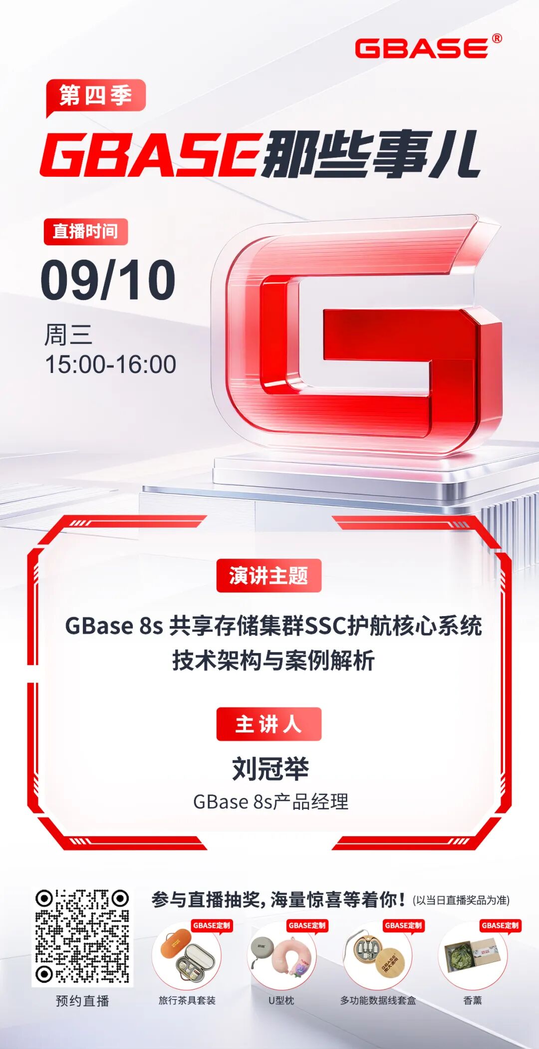 9月10日15:00,南大通用GBase 8s产品经理刘冠举将在“GBASE数据库”直播间分享《GBase 8s 共享存储集群SSC护航核心系统:技术架构与案例解析》主题演讲,为您详细拆解GBase 8s共享存储集群的技术细节,并介绍其在重点行业核心业务系统的实践应用。扫描下方二维码预约直播,期间更有互动抽奖,精美礼品等您拿~