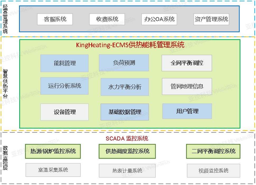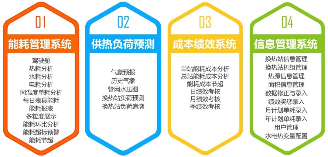 KingHeating-ECMS智慧供热能耗管理平台共分为能耗管理系统、供热负荷预测、成本绩效系统、信息管理系统四大系统模块。