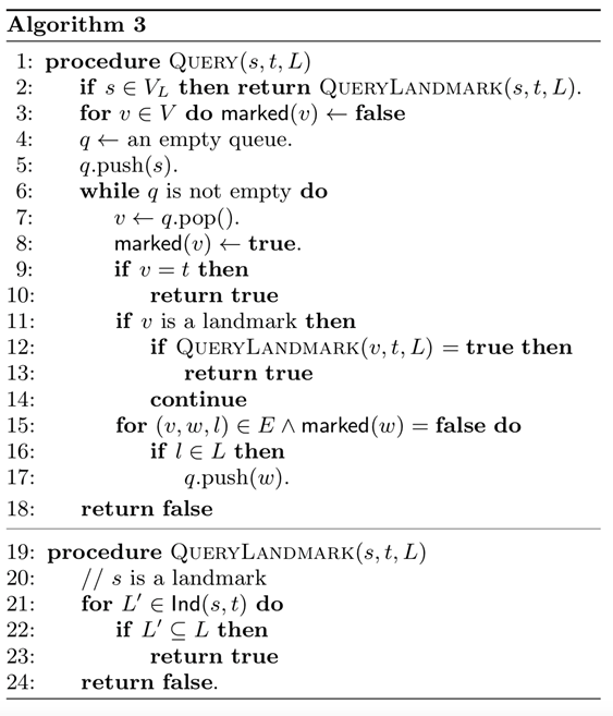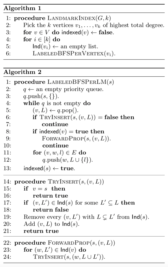 从rare label出发搜索,能有效减小搜索空间,提高效率。算法2 基于Landmark index(LI)的算法 (LucienD.J. Valstar, George H.L. Fletcher, and Yuichi Yoshida. 2017. Landmark Indexingfor Evaluation of Label-Constrained Reachability Queries. In Proc. SIGMOD ’17.)这篇文章提出了基于Landmark index算法,解决Label-Constrained Reachability(LCR)问题。LCR问题给出起点和终点点对(s,t)以及一个label的集合,想得到“能否通过所有label都在集合中的path从s走到t”。LCR问题是RPQ的子集,相当于正则表达式形式为(a|b|c|…|n)*的RPQ。LI算法选取度数(入度和出度之和)最大的k个顶点作为landmark(algorithm 1)。在每个landmark vertex s上构建索引Ind(s)。索引Ind(s)满足:(v, L)在Ind(s)中当且仅当L是连接s和v的最小label集合(algorithm 2)。给定一个查询(s, t, L),我们从s开始执行考虑label的BFS搜索来寻找landmark vertex,之后从landmark vertex的索引中获得问题的解(algorithm 3)。(Sarisht Wadhwa, Anagh Prasad, Sayan Ranu,Amitabha Bagchi, and Srikanta Bedathur. 2019. Efficiently Answering RegularSimple Path Queries on Large Labeled Networks. In Proc. SIGMOD '19)这个算法解决的问题是,给定起点和终点(s, t),想得到“是否存在从s到t的满足RPQ的路径”。这个算法给出的是一个有假阴性的解。算法从s和t出发,进行双向的随机游走。选择下一跳邻居的要求是,跳到下一个之后,path依然是simple的,同时path的label串要能匹配上正则表达式的前缀(这样,继续往下游走才可能匹配上整个正则表达式)。没有合法的下一跳