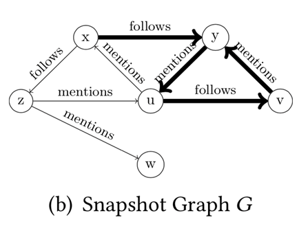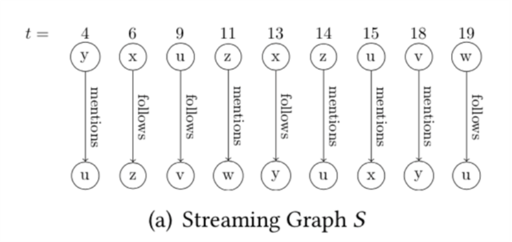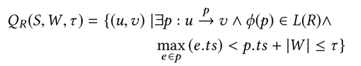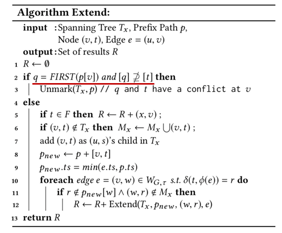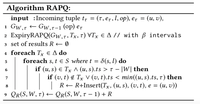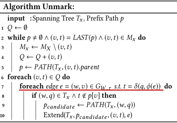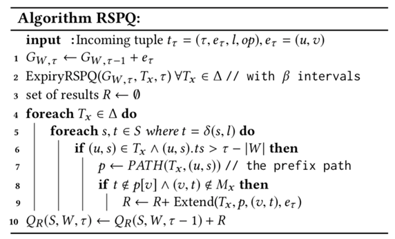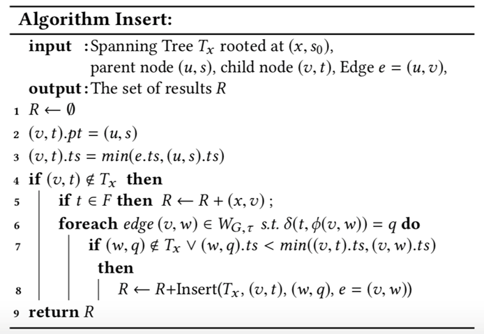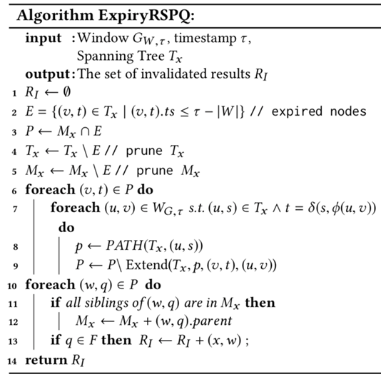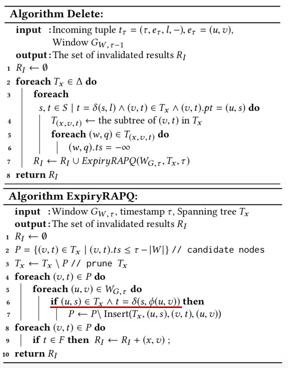 我们进行若干次这样的双向随机游走,就能得到一个有假阴性率的解决RPQ问题的算法。(Anil Pacaci, Angela Bonifati, and M. Tamer Özsu.2020. Regular Path Query Evaluation on Streaming Graphs. In Proceedings of the2020 ACM SIGMOD International Conference on Management of Data (SIGMOD '20).Association for Computing Machinery, New York, NY, USA, 1415–1430.)这个算法解决的是流图上的RPQ问题。Streaming RPQ的解就是在流图的snapshot graph上做RPQ得到的解。形式化定义如下:具体而言,文章对4类问题提出了算法。Path semantics指的是这个问题的解需要是simple path或者不需要;resultsemantics指的是是否需要支持显式删除。算法的核心思路是,通过用spanning tree记录历史的对于流图的snapshot graph和DFA的product graph的DFS,实现增量的RPQ算法。如下图,分别为图流、图流的snapshot graph、正则表达式R对应的DFA、snapshot和DFA的productgraph、spanning tree。Arbitrary & append-only的算法如下:Arbitrary &支持显式删除的算法如下,删除整个子树,并在spanning tree中补上之前剪枝的DFS搜索。对于simple path semantics,因为我们要保证path中没有重复的节点,访问到节点的路径会影响这个节点的后续搜索,所以我们在DFS时遇到已经访问过的节点不能停止搜索。