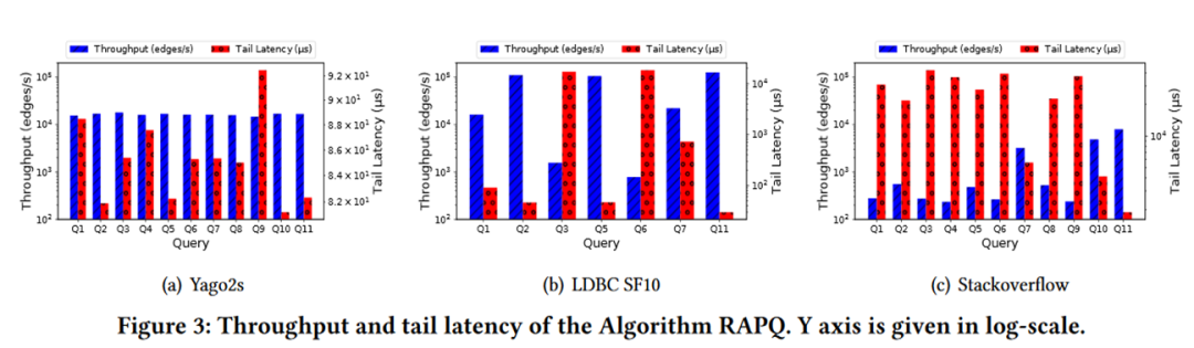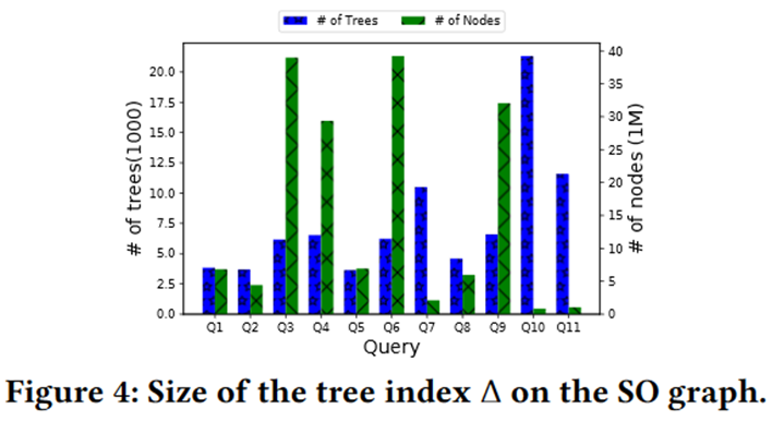 下图figure 3 和4显示了不同query在不同数据集上的运行速度,以及stackoverflow上spanning tree的大小。