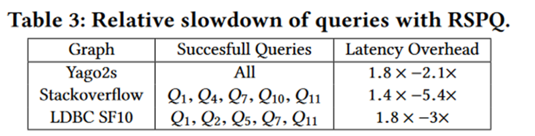 Table 3 显示了不同数据集上simplepath比arbitrary path额外的开销。开销主要来自于conflict的检测,以及对是否属于Mx的标记的维护。Yago2s中没有conflict,Q1、Q4、Q11都是conflict-free的,所以比较快;SO是highly cyclic的,所以比较慢。