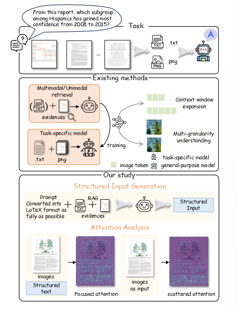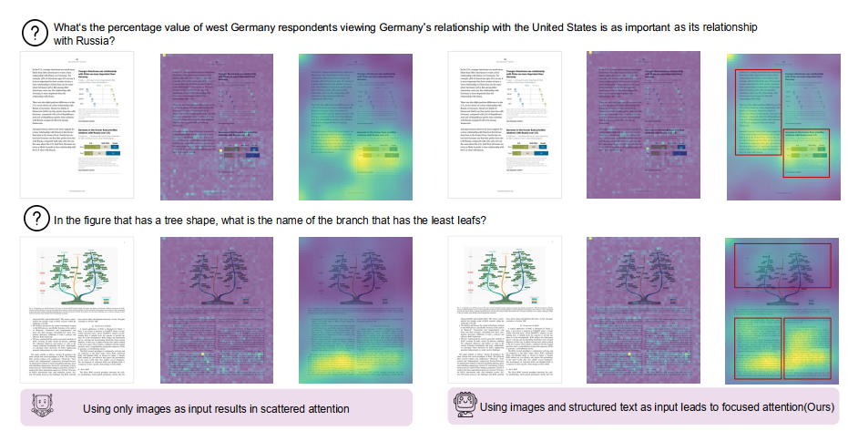 多模态大语言模型(Multimodal Large Language Models, MLLMs)蓬勃发展的今天,文档理解(Document Understanding)作为一项涉及文本、图表和图像的复杂任务,依然面临诸多挑战。如何高效整合多源信息、理解文档的层次结构,成为提升 MLLMs 性能的关键问题。研究发现了一种无需修改模型架构或额外训练的新方法:仅通过结构化输入提升 MLLMs在文档问答(DocQA)任务中的表现,同时通过注意力分析实践探寻结构化输入带来性能提升的深层原因。