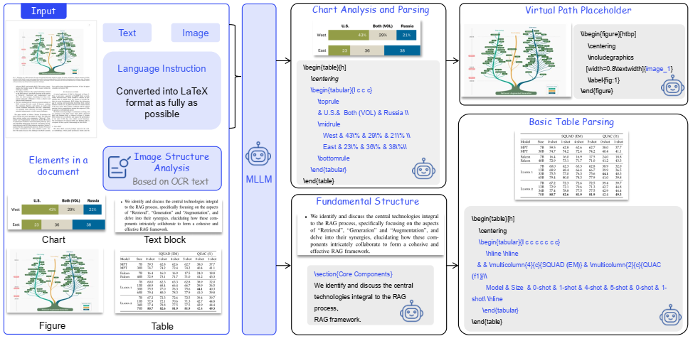 为解决这一问题,提出了一种基于 LaTeX 范式的结构保留方法。该方法通过保留文档的层次结构和空间关系(如标题、表格、图像的位置),从而为模型提供更清晰的语义引导。