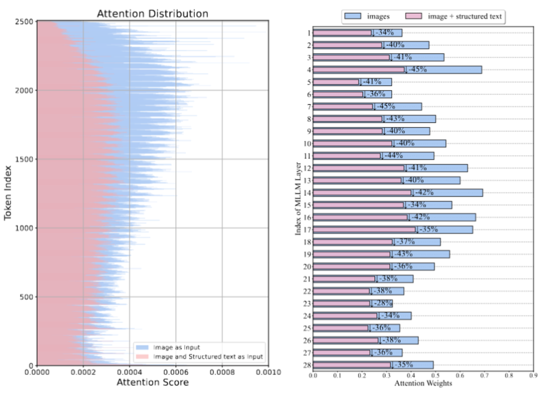 注意力分析:通过比较仅图像输入、图像加无结构文本、图像加结构化文本三种情况的注意力分布,发现结构化输入显著减少了注意力浪费,引导模型聚焦于语义相关的文本和图像区域。