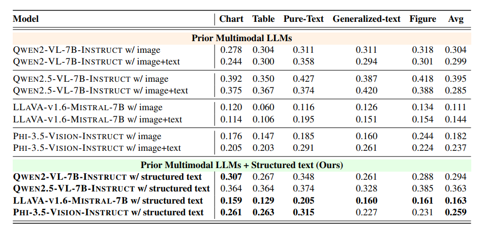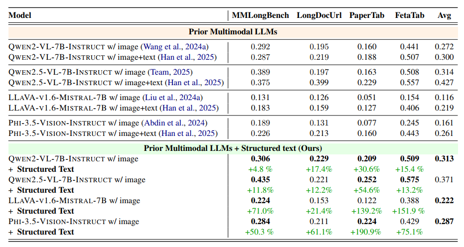 在四个文档理解基准数据集(MMLongBench、LongDocUrl、PaperTab、FetaTab)上测试4种 MLLMs 模型(如 QWEN2-VL-7B-INSTRUCT、Phi-3.5-Vision-Instruct)。结果显示,结构化输入在所有数据集上均提升了模型性能,尤其在包含复杂图表的 PaperTab 数据集上效果显著。消融实验进一步证明,仅用结构化文本或仅用图像的性能均低于两者结合,验证了结构化输入与图像联合使用的必要性。