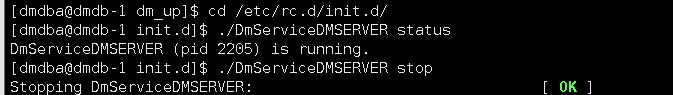 #视自己服务配置cd /etc/rc.d/init.d/ ./DmServiceDMSERVER status ./DmServiceDMSERVER stop 或者 systemctl stop DmService