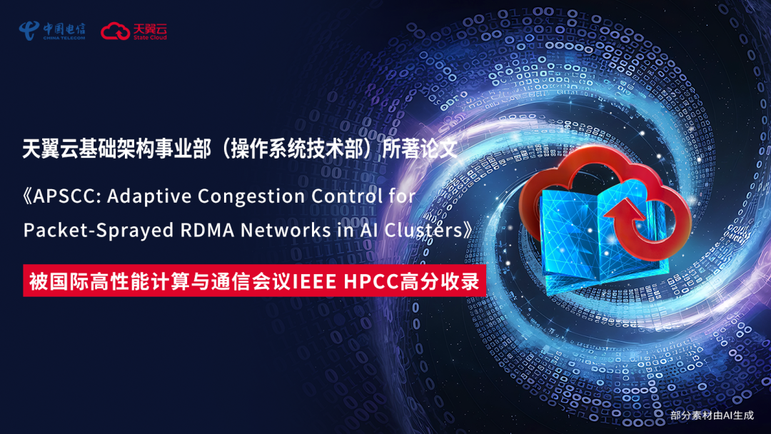 近日,由天翼云科技有限公司基础架构事业部(操作系统技术部)高性能网络研发团队撰写的论文《APSCC: Adaptive Congestion Control for Packet-Sprayed RDMA Networks in AI Clusters》被2025年第27届IEEE国际高性能计算与通信会议(HPCC)高分录用。这标志着天翼云在高性能网络与人工智能集群通信领域的核心技术已达到国际领先水平,体现了天翼云在自主创新方面的强大实力。