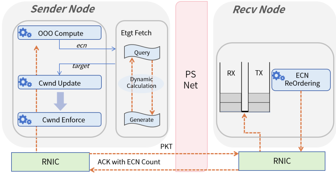(1)发送方负责发送数据包,并执行拥塞控制的主要响应逻辑,包括目标阈值计算和窗口更新;