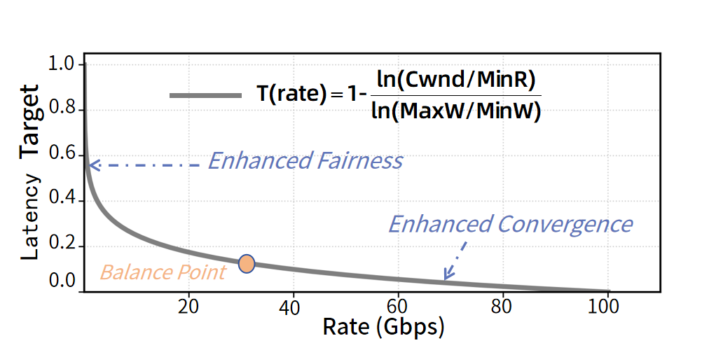 为进一步在统一ECN标记阈值下实现交换机间的公平性与收敛性,APSCC采用动态计算公式来确定目标ECN比率。如下图所示,该阈值函数以当前拥塞窗口大小作为主输入参数:窗口增大时,阈值相应降低,使发送方能够更迅速地响应拥塞并倾向于降速;相反,拥塞窗口较小的流则被分配较高阈值,从而获得更大容忍度与更多速率增长机会。
