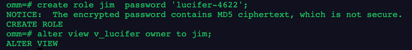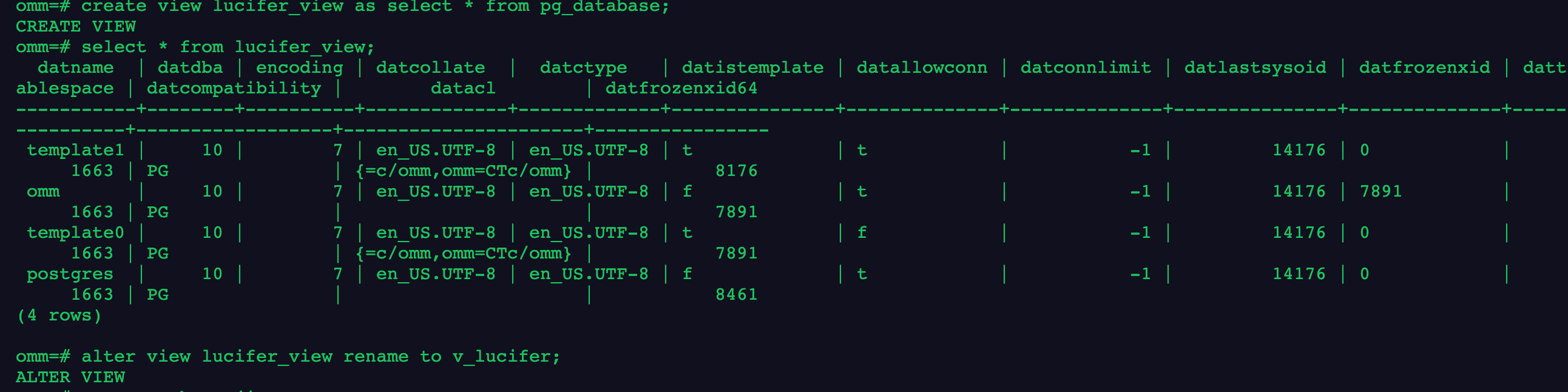 1、为系统表PG_DATABASE创建视图,重命名视图并修改owner为jim,